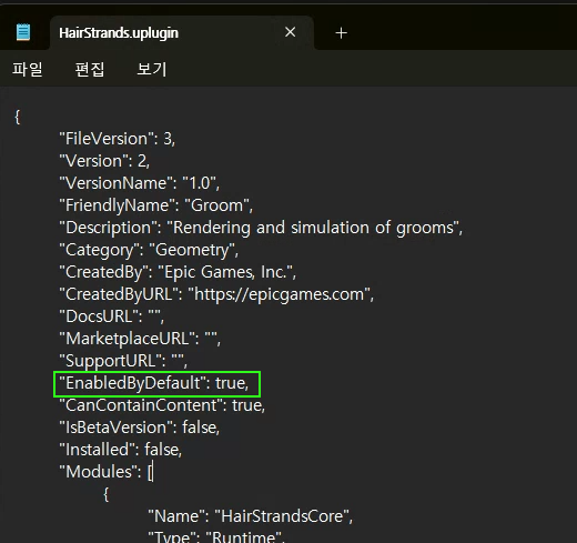 HairStrands.uplugin 파일 "EnabledByDefault": false를 ture로 변경