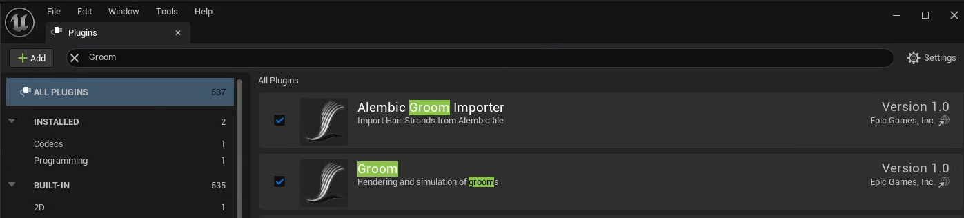3. 플러그인 추가 [Groom, Alembic Groom Importer]