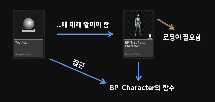 A 블루프린트가 B 블루프린트에 대해 접근하기 위해서, 또는 그 안에 변수가 있는 경우 이 캐스팅하는 블루프린트를 먼저 로드해야 하기 때문이다.