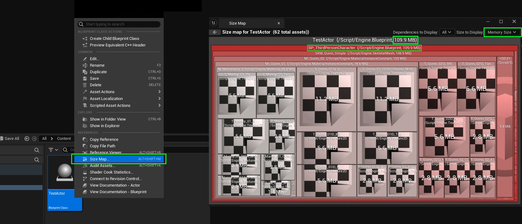 생성한 테스트 액터를 우클릭하여 Size Map을 통해 해당 에셋이 차지하는 메모리 크기를 보자.