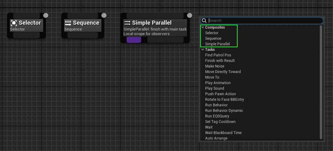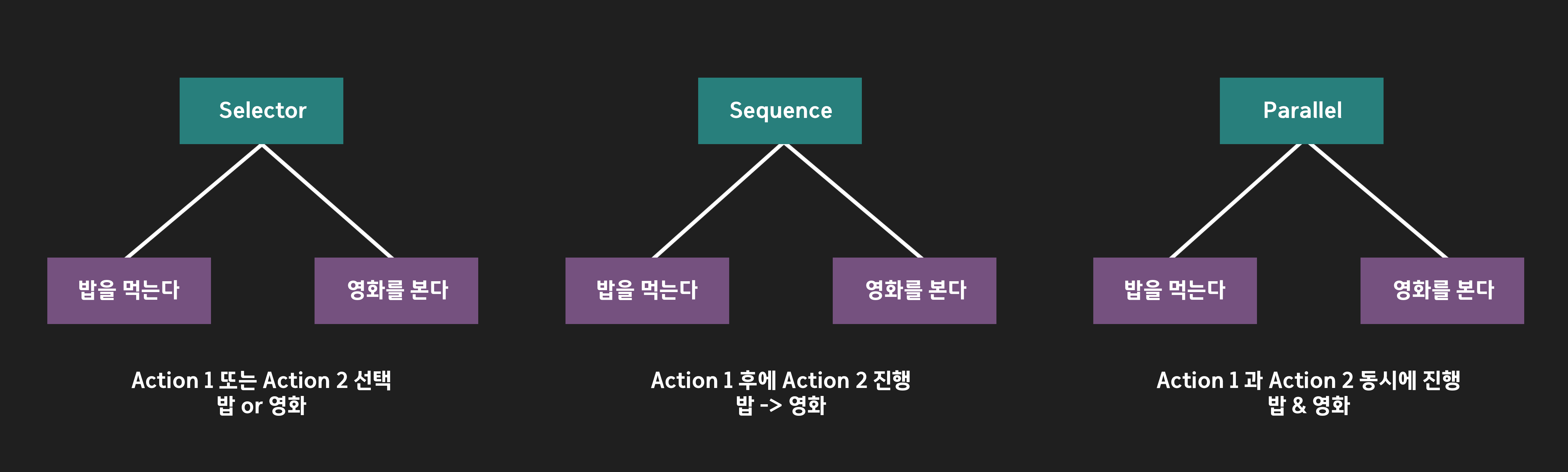 이 행동은 컴포짓(Composite)이라는 상위 노드를 통해 실행되는데, 컴포짓은 어떻게 수행하느냐에 따라서 나뉜다.