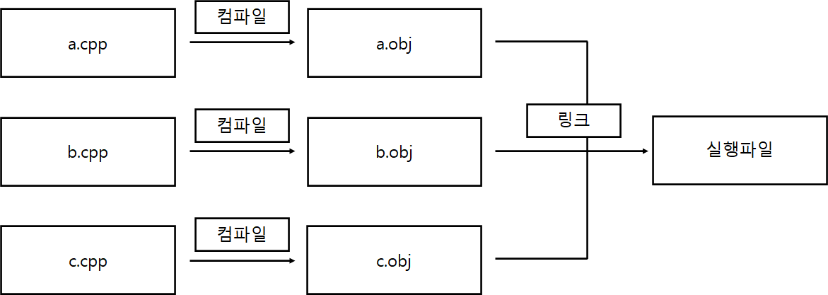컴파일은 컴파일러가 처리하며, C++ 소스 파일 즉, .cpp 파일 단위로 컴파일을 진행한다.