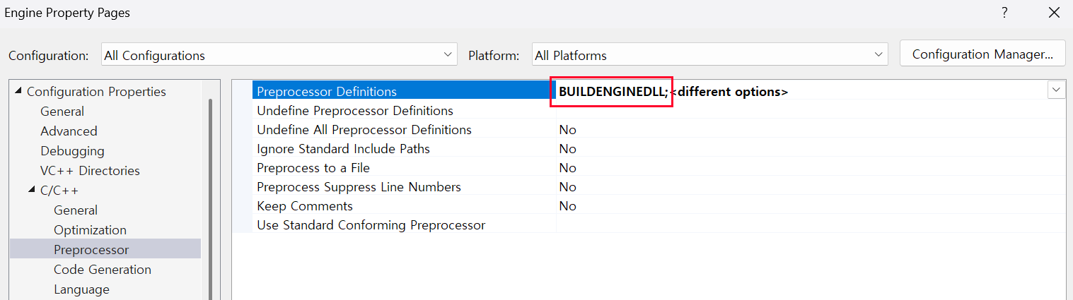 Engine의 프로젝트 속성에서, C/C++의 Preprocessor로 가서, Preprocessor Definitions에 BUILDENGINEDLL; 구문을 추가한다.