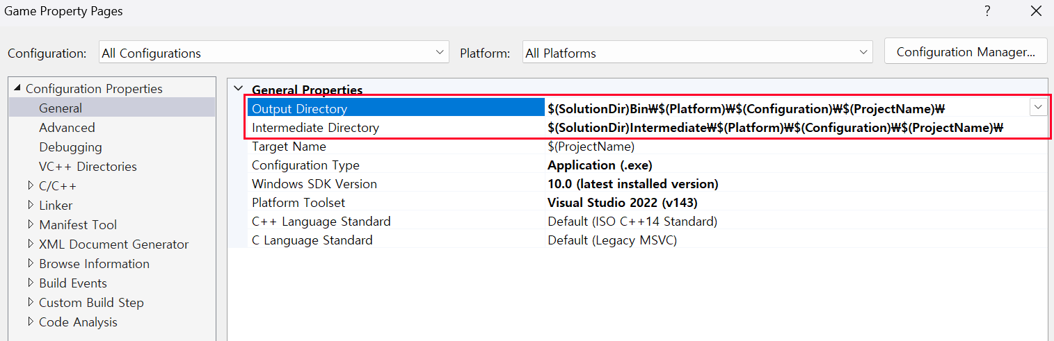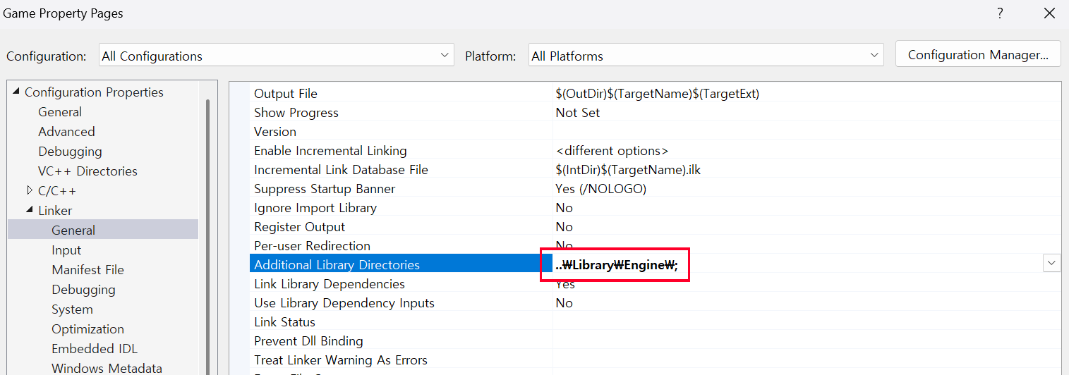 Game 프로젝트의 설정으로 가서, C/C++ -> General -> Additional Include Directories에 Includes 폴더 경로를 추가한다.