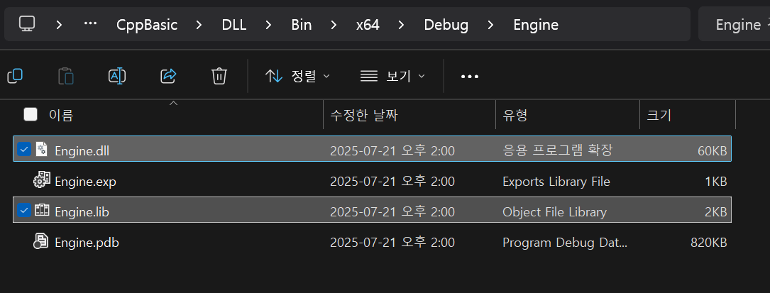 위와 같이 설정 후, DLL 프로젝트를 빌드해 보면 다음과 같은 경로에 .dll 파일과 .lib 파일이 생긴다.