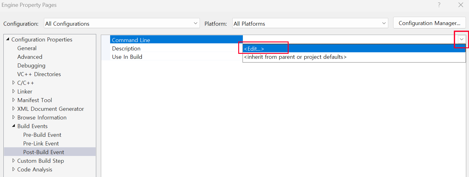 Engine 속성의 Build Events의 Post-Build Event로 가서, 다음 코드를 넣는다.