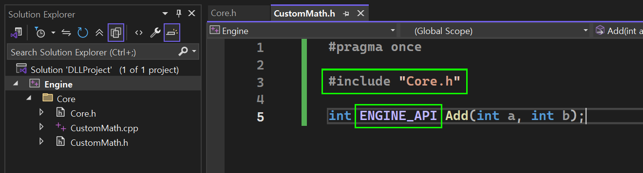 이렇게 설정해 주면, 이제 Engine 프로젝트에서는 #define ENGINE_API __declspec(dllexport) 구문이 활성화되는 것을 확인할 수 있다.