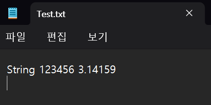 - 파일에 데이터를 출력할 때는 << 연산자를 사용하는데, 콘솔에서와 마찬가지로 기본 타입에 대해 출력이 가능하며, 예제에서 사용한 것과 같이 연쇄적으로 출력을 처리할 수 있다.