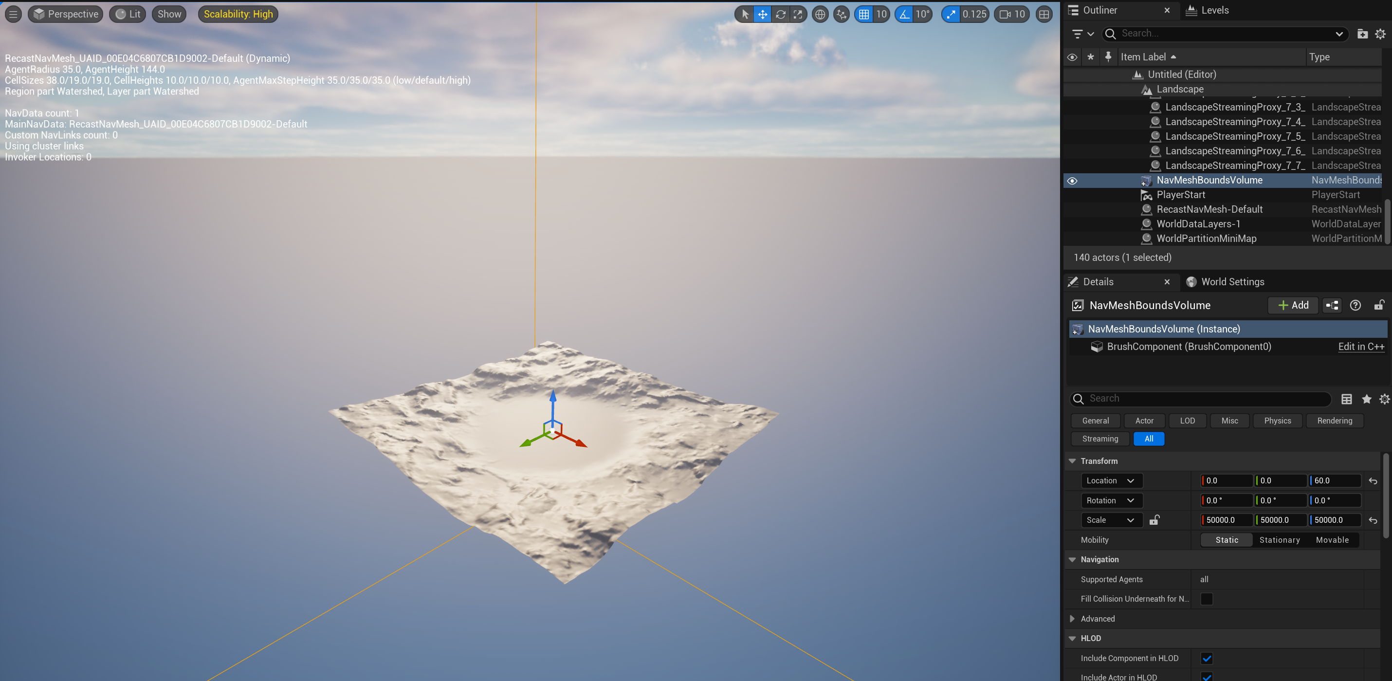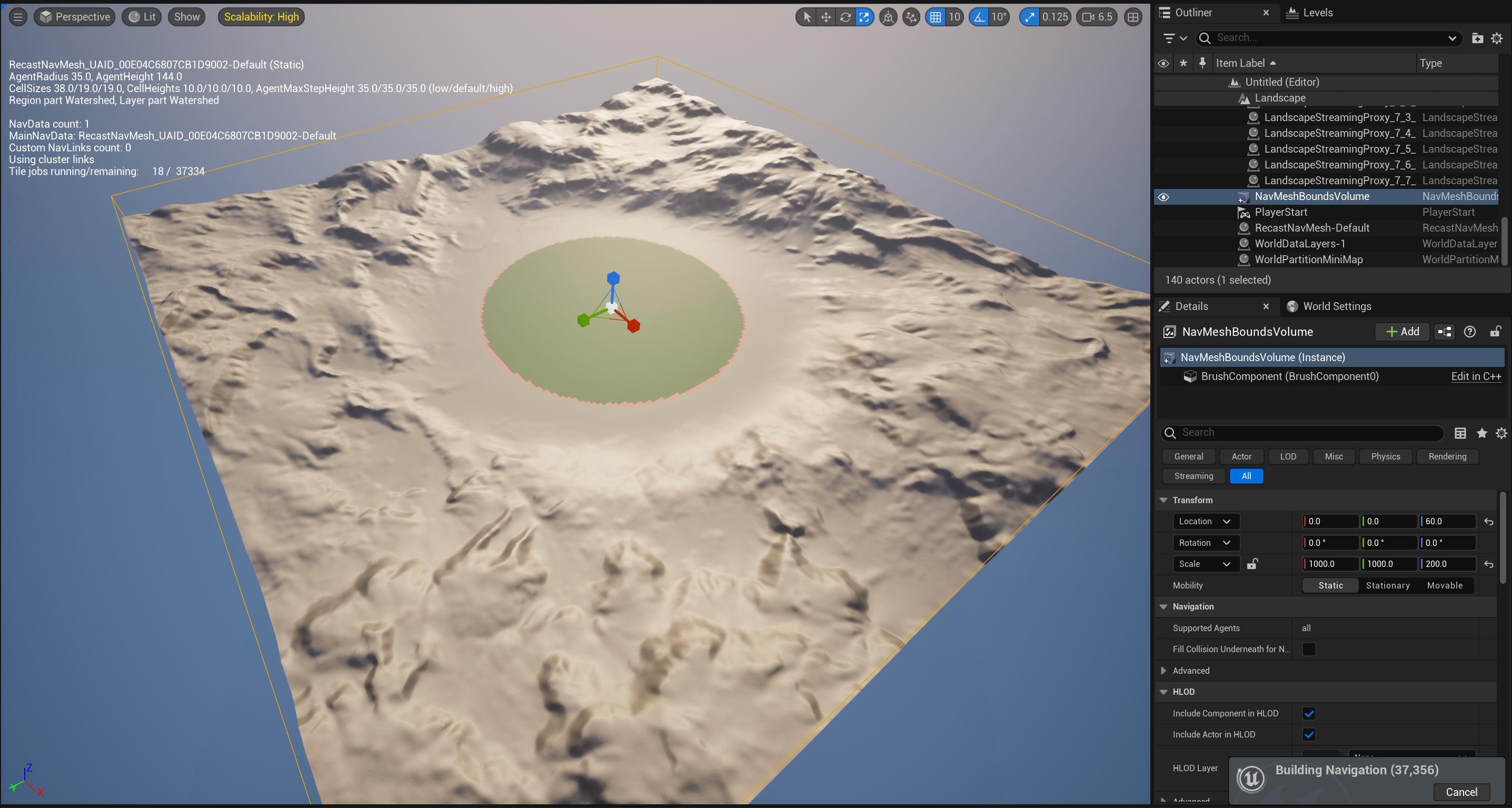일단 무지성으로 NavMeshBoundsVolume을 크게 늘리면 다음과 같이 연산이 엄청 오래 걸린다.