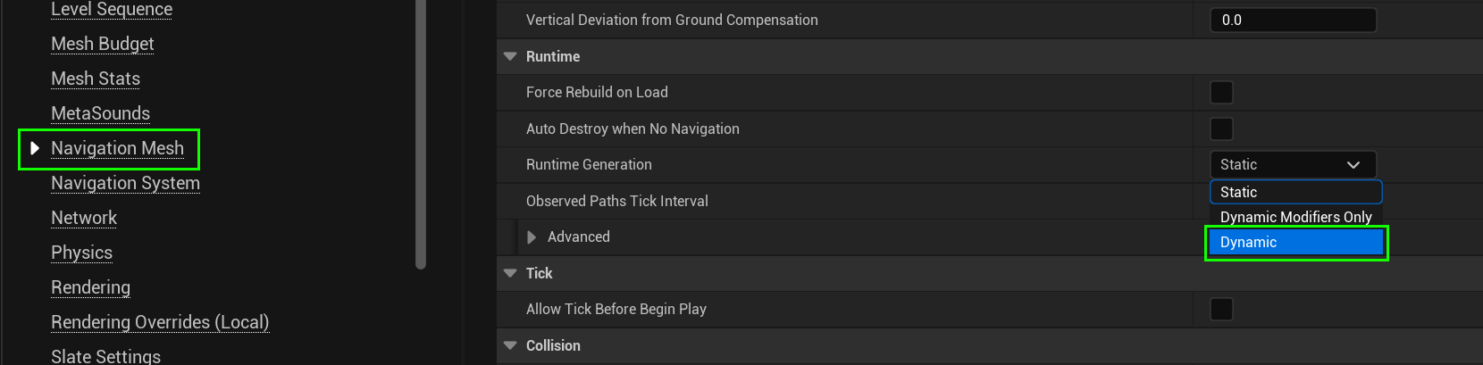 먼저, Navigation 연산을 런 타임에 할 수 있도록 Runtime Generation 옵션을 Dynamic으로 설정한다.